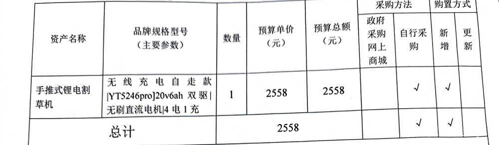 为了做好园内草坪的维护工作,特采购一台割草机用于园区除草。特此公示,公示日期: